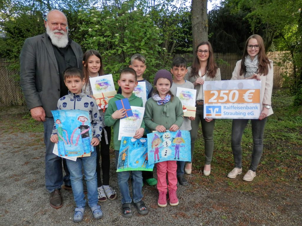 Freundschaft ist bunt – so lautete das Thema des diesjährigen Internationalen Jugendwettbewerbs der Volks- und Raiffeisenbanken. Mit Freunden erlebt man was: zusammen Spaß haben, gemeinsam ins Kino gehen, Sport treiben oder Musik machen. Mit Freunden verbringen die Kinder jede Menge Freizeit und entdecken gemeinsam ihre Welt. Die beiden Betreuerinnen des Jugendwettbewerbs der Raiffeisenbank Straubing, Anna-Lena Hafner (re.) und Beatrice Bründl überbrachten den Schulsiegern des diesjährigen Wettbewerbs Urkunden und Wertgutscheine. Ausgezeichnet wurden von links: Philipp Lehner, Julie Marquardt, Tizian Listl, Ardit Avdyli, Xenia Dippel und Elmin Nuhanovic. Außerdem erhielt Schulleiter Erich Gruber für die zahlreiche Teilnahme eine Spende von 250.- € aus dem Gewinnsparverein für soziale Zwecke.