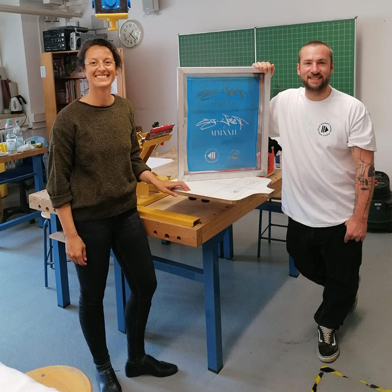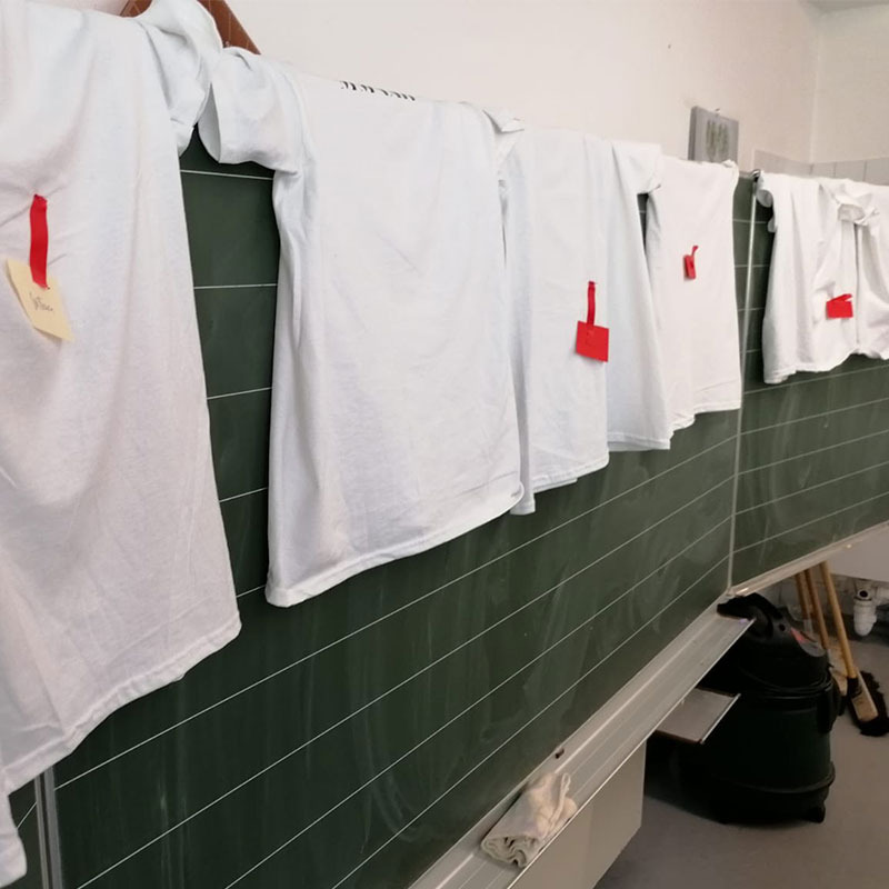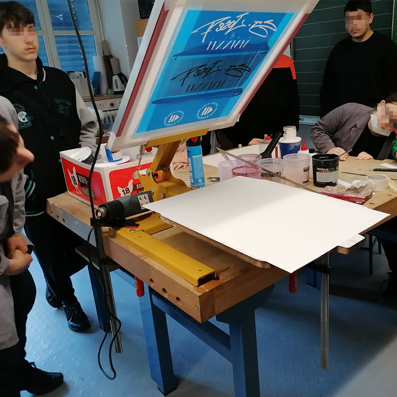 PRAKTISCHER UNTERRICHT: Vorab erstellen wir ein Siebdruck Sieb von dem durch die Schüler erstellten Logo. Dieses kann einen Rücken- und/oder Vorderdruck enthalten. Mit unserer mobilen Siebdruck Maschine werden die Schüler vorab in die Drucktechnik eingewiesen. Wir erklären die Funktionsweise der Maschine, die Vorbereitung und das Einrichten des Siebs sowie die richtige Zusammenstellung der Druckfarben. Anschließend können die Schüler erste Erfahrungen beim Druck auf Papier sammeln. Hierbei gilt es die richtige Rakeltechnik für den späteren Textildruck zu erlernen. Die Schüler sollen ein Gespür für Anpressdruck und Rakelstellung entwickeln. Dies erfordert anfangs koordinatives Geschick. Beim Ausrichten des Papiers und zur richtigen Positionierung auf der Druckplatte, wird zudem das räumliche Denken geschult. Die Schüler drucken dann ihre EIGENEN T-Shirts.