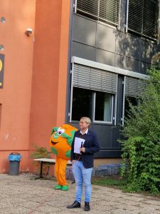 Ein Namensschild war jedoch noch übrig. „Ja, wo ist denn die Mimi?“, fragte Stefanie Engl ihre Schüler überrascht. Die wussten auch nicht, wo Mimi abgeblieben ist. „Mimi komm, wo versteckst du dich?“ „Vielleicht ist sie im Schrank?“ „Hinter dem Vorhang? Wir müssen sie suchen!“ Die Kinder schauten aufgeregt durch das Klassenzimmer. Doch auf einmal blitzte Mimi mit ihren braunen Strubbelhaaren und der blauen Latzhose aus einem Korb hervor. Die kleine Puppe wird die Grundschulkinder ab jetzt auf ihrem Schulweg begleiten. Und um Mimi zu zeigen, was sie können, durften die Erstklässler gleich einmal zählen: „Eins, zwei, drei, vier…“