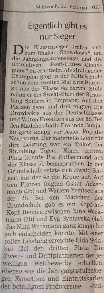 Die Klassensieger trafen sich zum finalen „Showdown“, um die Jahrgangsstufensieger und letztendlich die ultimativen „Josef-Fitness-Champions“ zu ermitteln. Konzentriert und überaus engagiert testeten die Jungen und Mädchen ihre Leistungsgrenzen aus. Als strahlender Champion ging in der Mittelschule schon zum zweiten Mal Eris Bunjaku aus der Klasse 6a hervor. Stolz nahm er ein exklusives Sweat-Shirt der Straubing Spiders in Empfang. Auf den Plätzen zwei und drei folgten Ilja Drozdeckis aus der Deutschklasse und Valton Kokollari aus der 8b. Bei den Mädchen hatte Erolinda Bunjaku ganz knapp vor Jesica Pop die Nase vorne. Der materielle Lohn für ihre Leistung war ein Trikot der Straubing Tigers. Einen tollen 3. Platz konnte Pia Rothermund aus der Klasse 5b für sich beanspruchen.