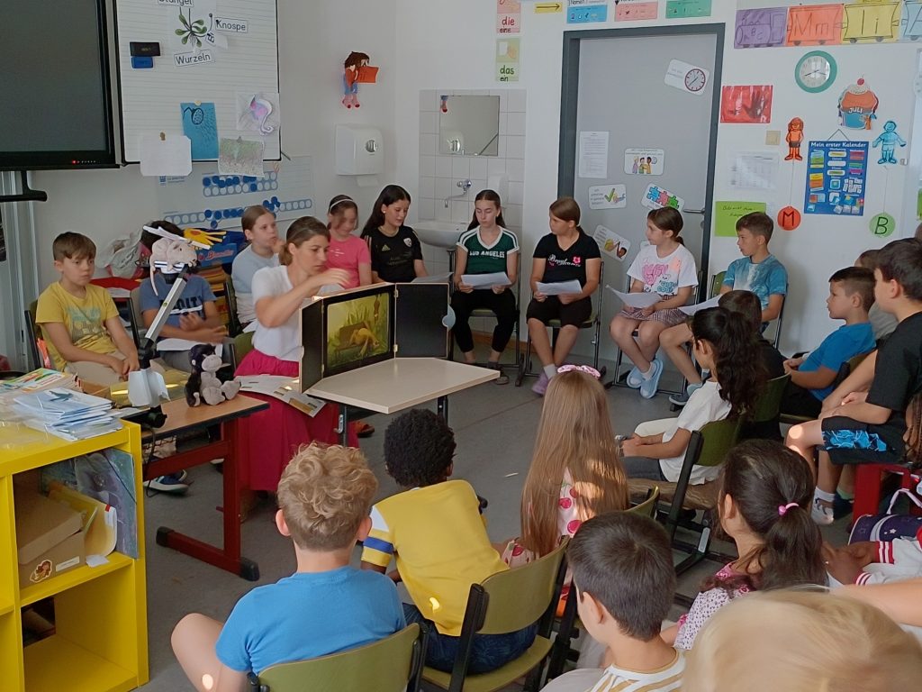 Die Schülerinnen und Schüler der Klasse 4a lasen den ersten Klassen von Frau Engl und Frau Schmitz die Geschichte „Der größte Schatz der Welt“ vor. Durch die Bilder des Kamishibai wurde diese Erzählung besonders anschaulich. Gespannt lauschten die Erstklässler den Vorlesern und Vorleserinnen zu.