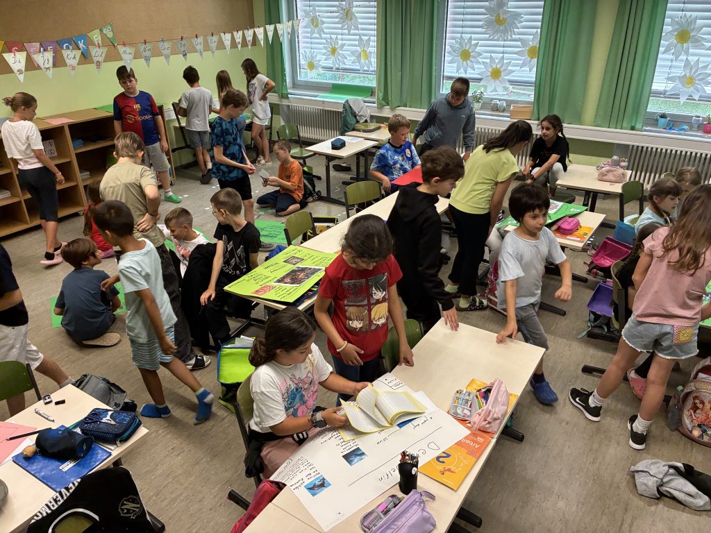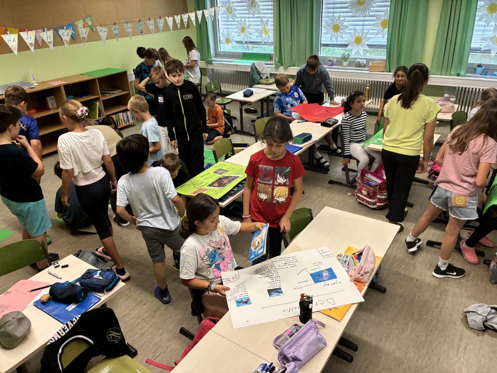 Große (4b) helfen Kleinen (2b) bei den Plakaten über Haustiere und bringen ihnen die wichtigsten Referattricks bei.